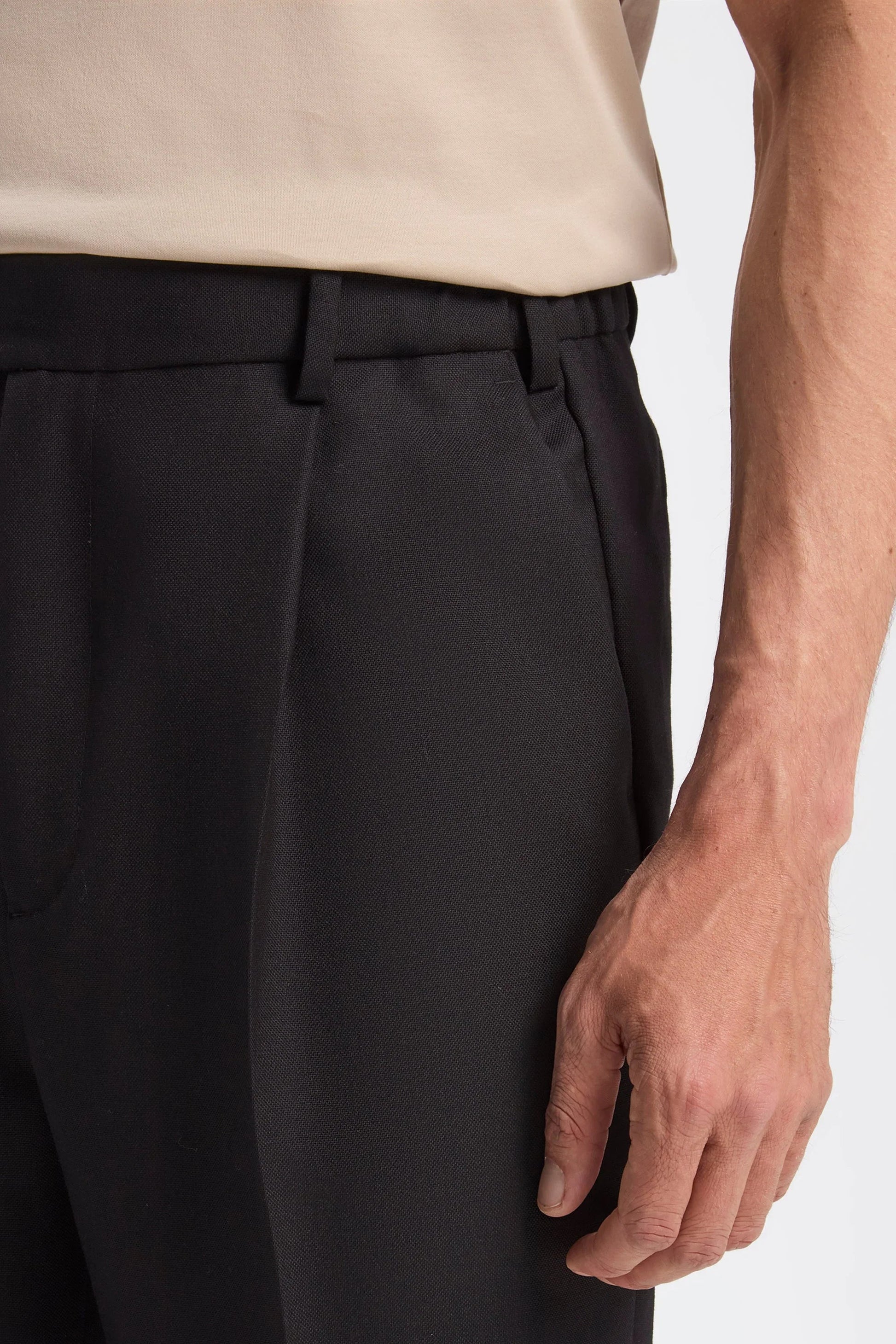 Wide leg trousers cut from a premium 50/50 wool blend for structure and drape. Designed with an extended front waistband, faux horn button closures, and side and back welt pockets. Elasticated at the sides for a comfortable fit.